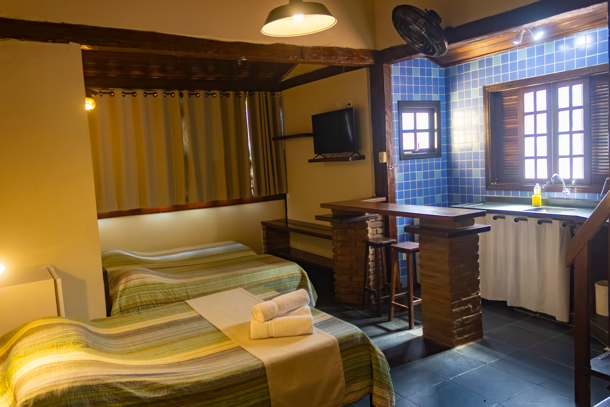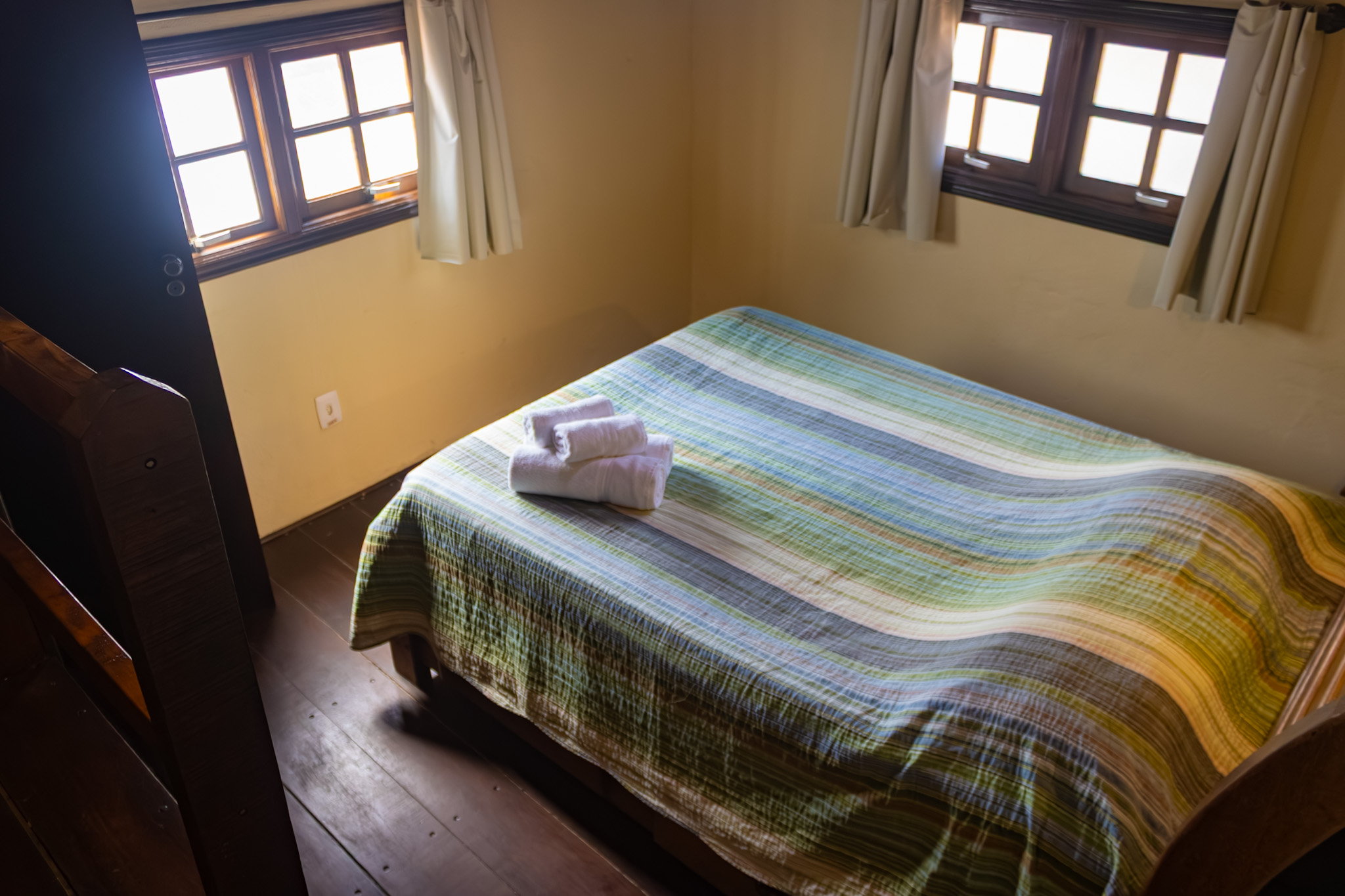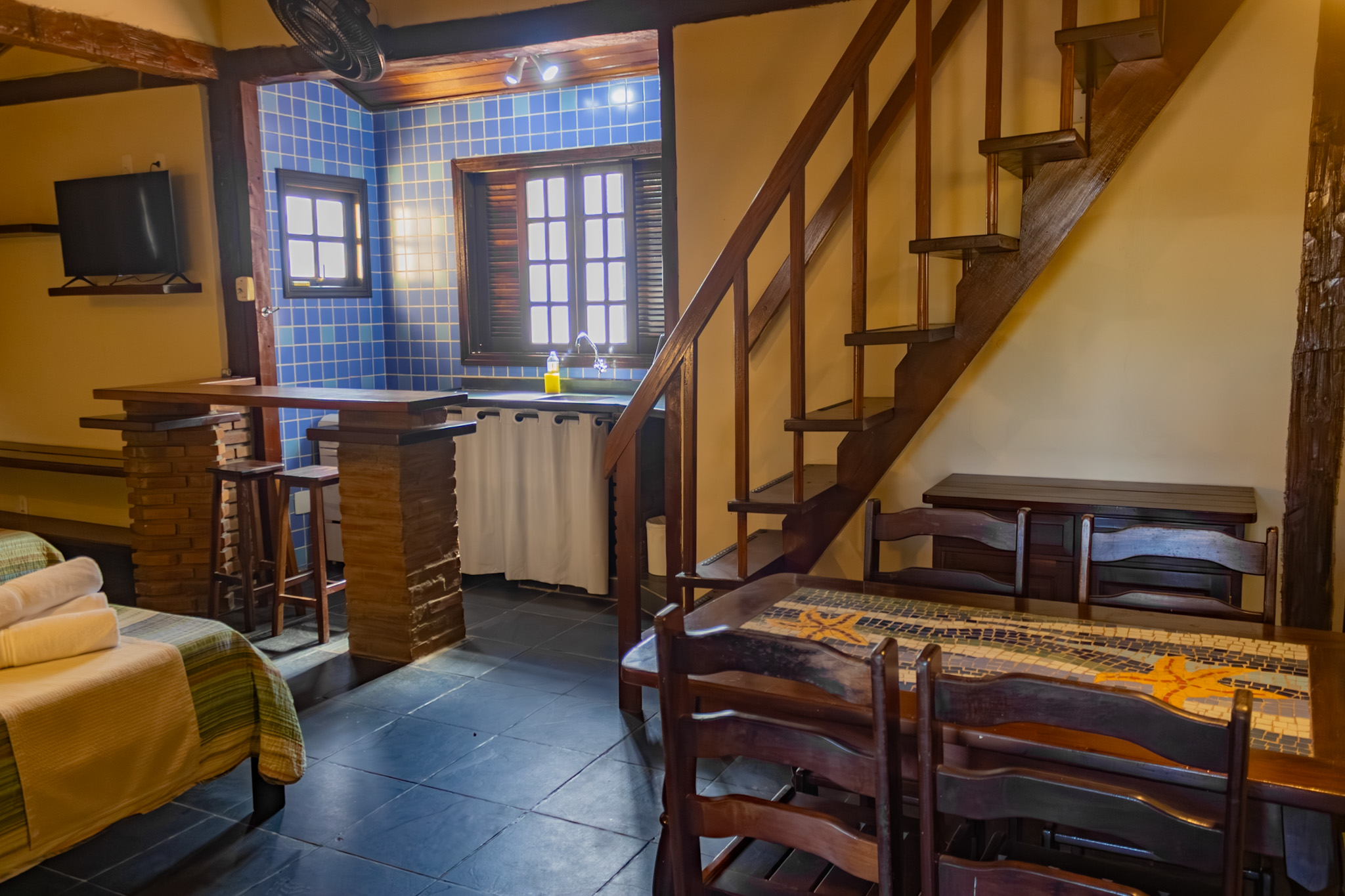 No mezanino (Atenção: a escada de acesso é íngreme), há uma suíte exclusiva com 1 cama de casal, ar-condicionado, TV e banheiro privativo.