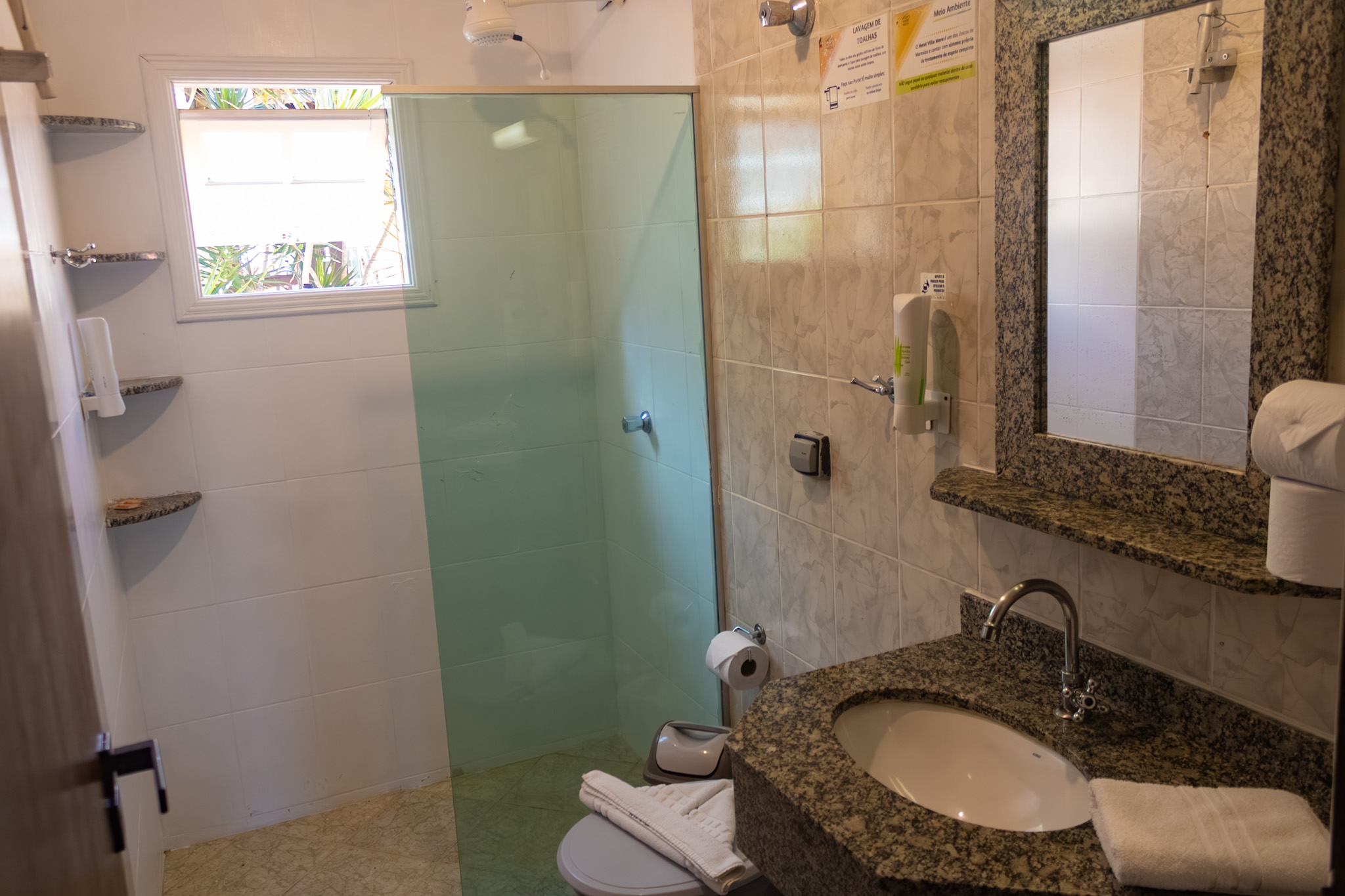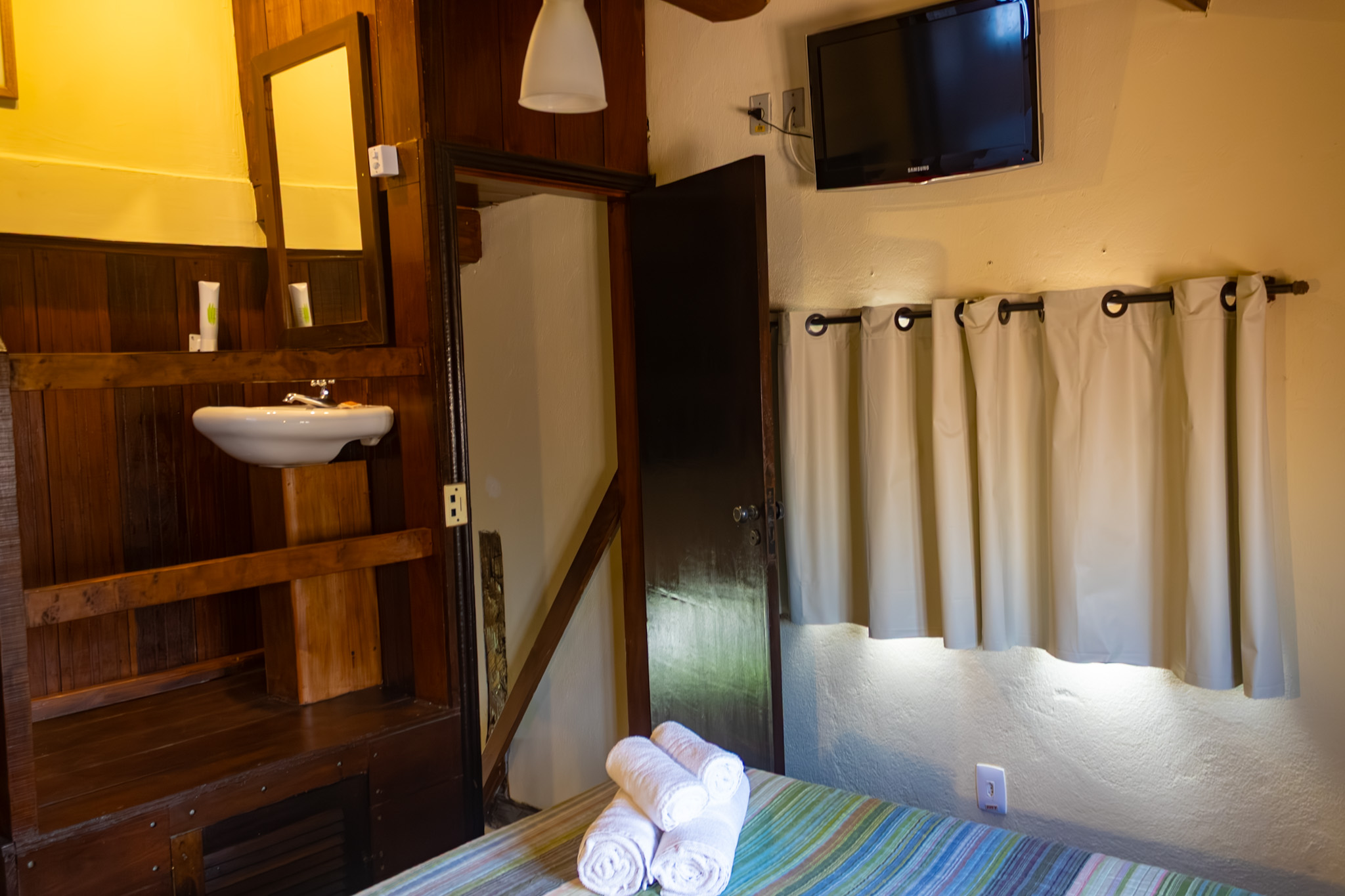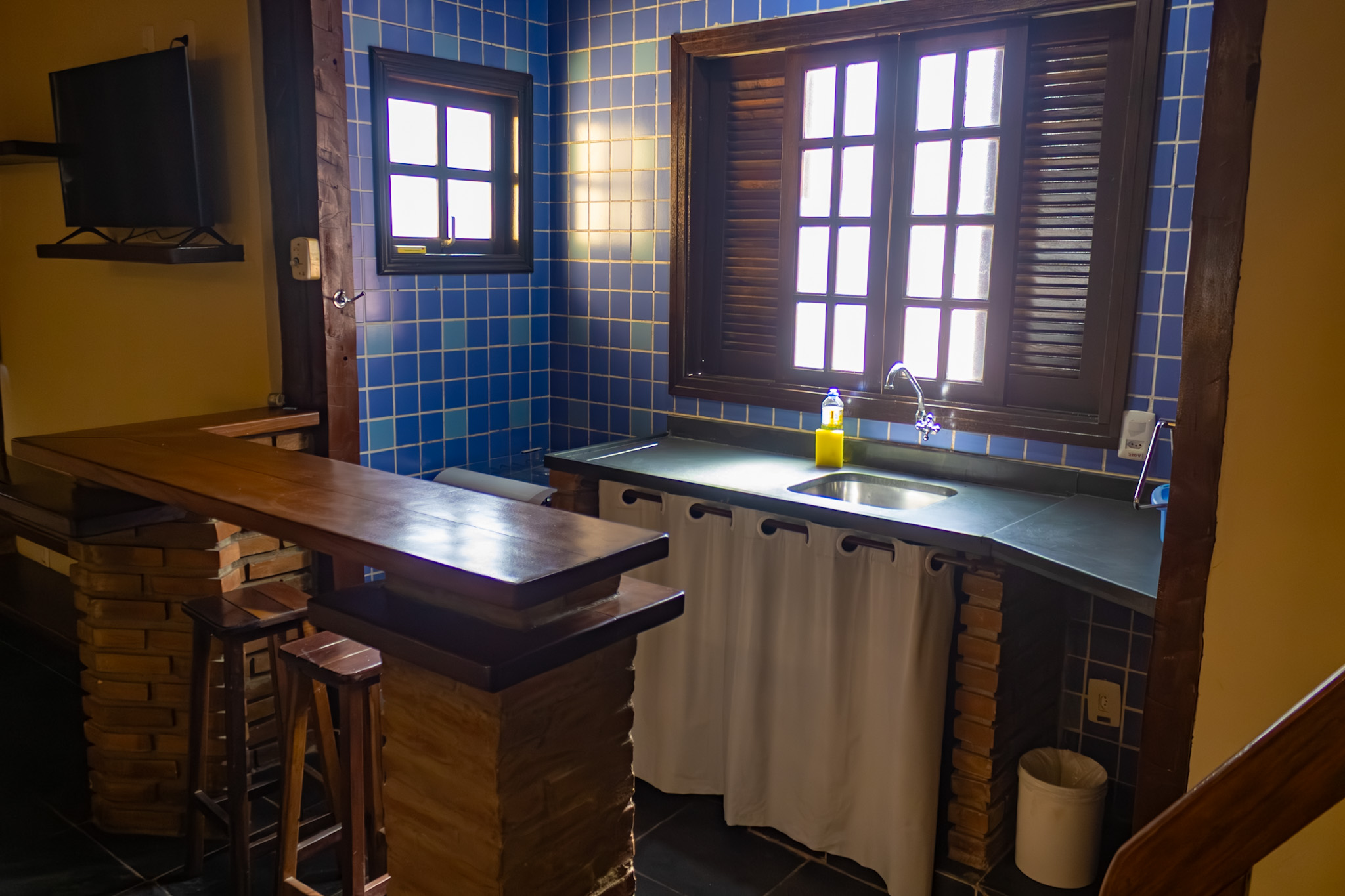 No mezanino (Atenção: a escada de acesso é íngreme), há uma suíte exclusiva com 1 cama de casal, ar-condicionado, TV e banheiro privativo.