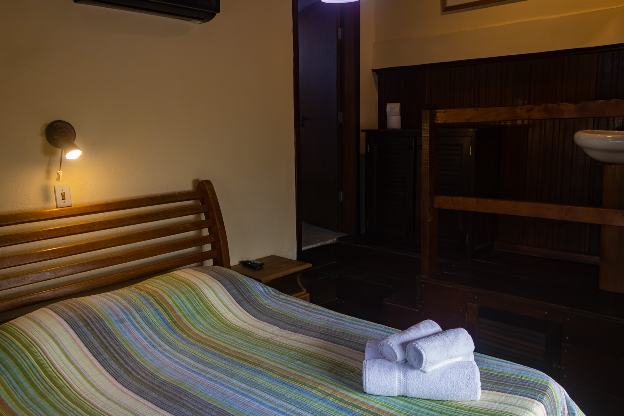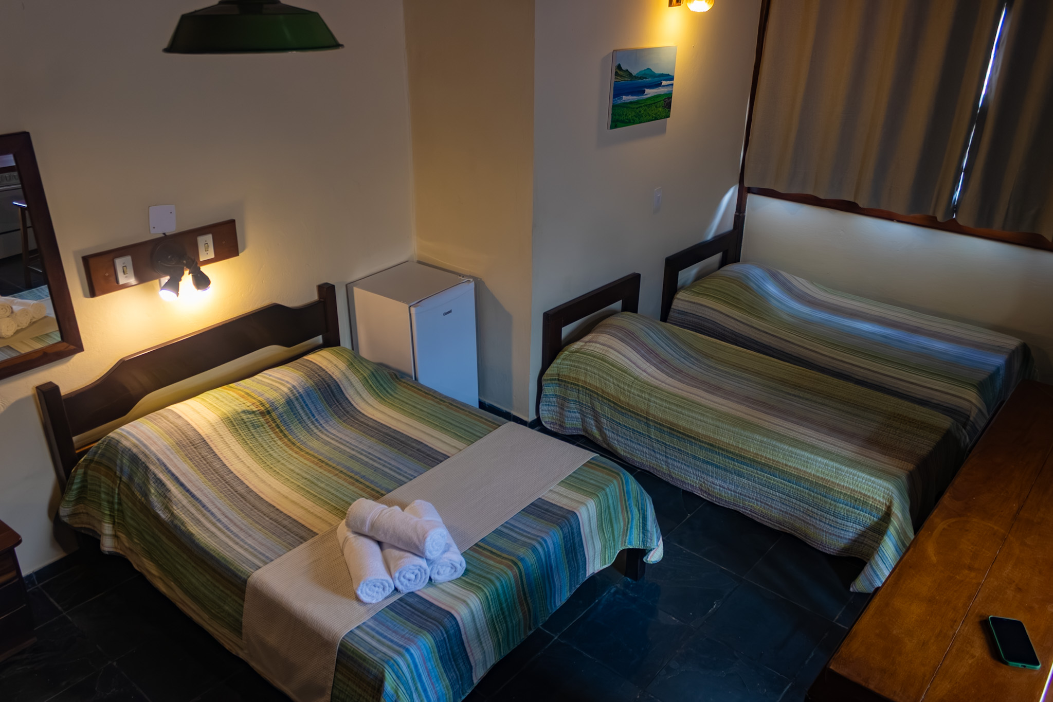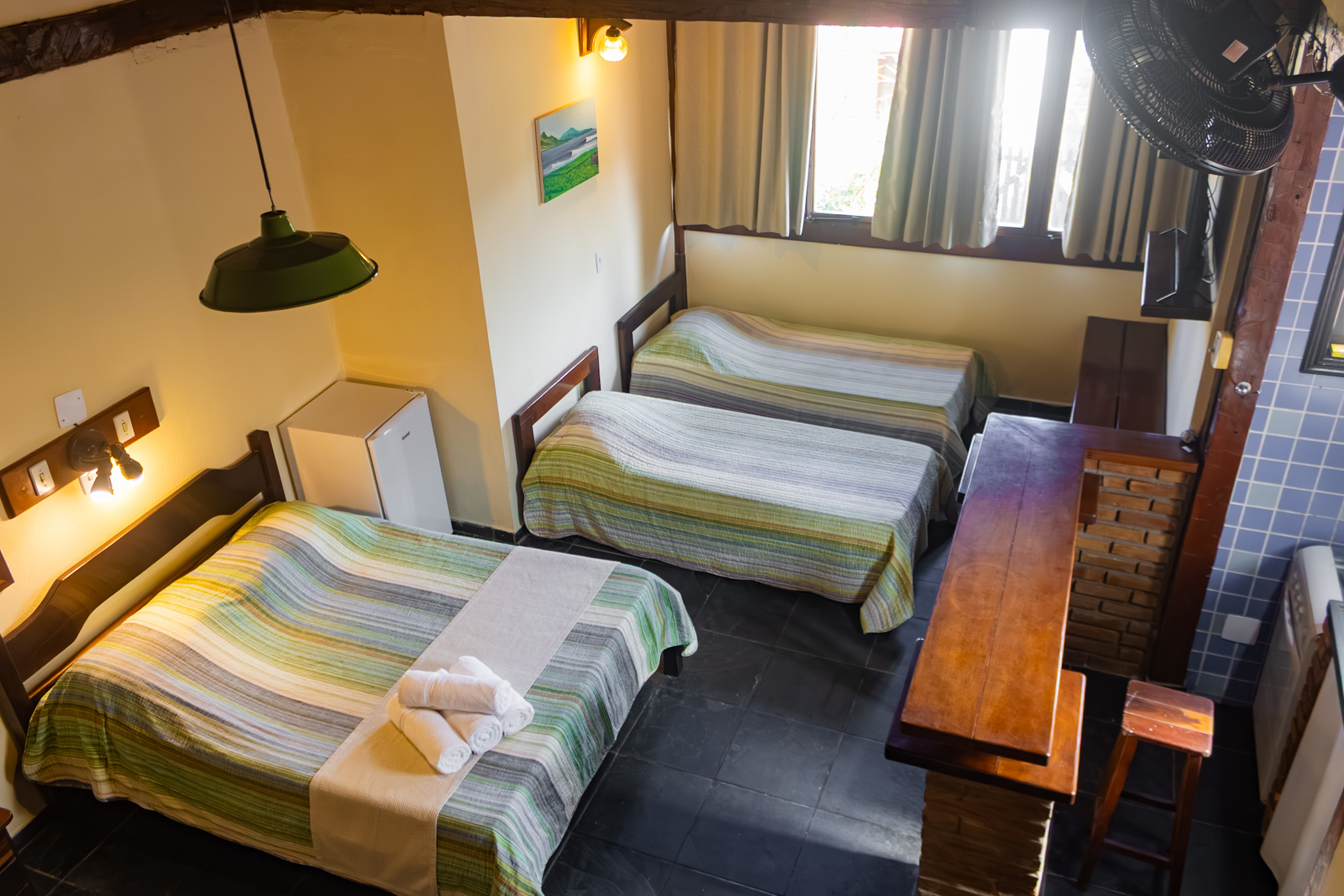 No primeiro piso, você encontra 1 cama de casal, 2 camas de solteiro, ar-condicionado, ventilador de teto, TV e frigobar.